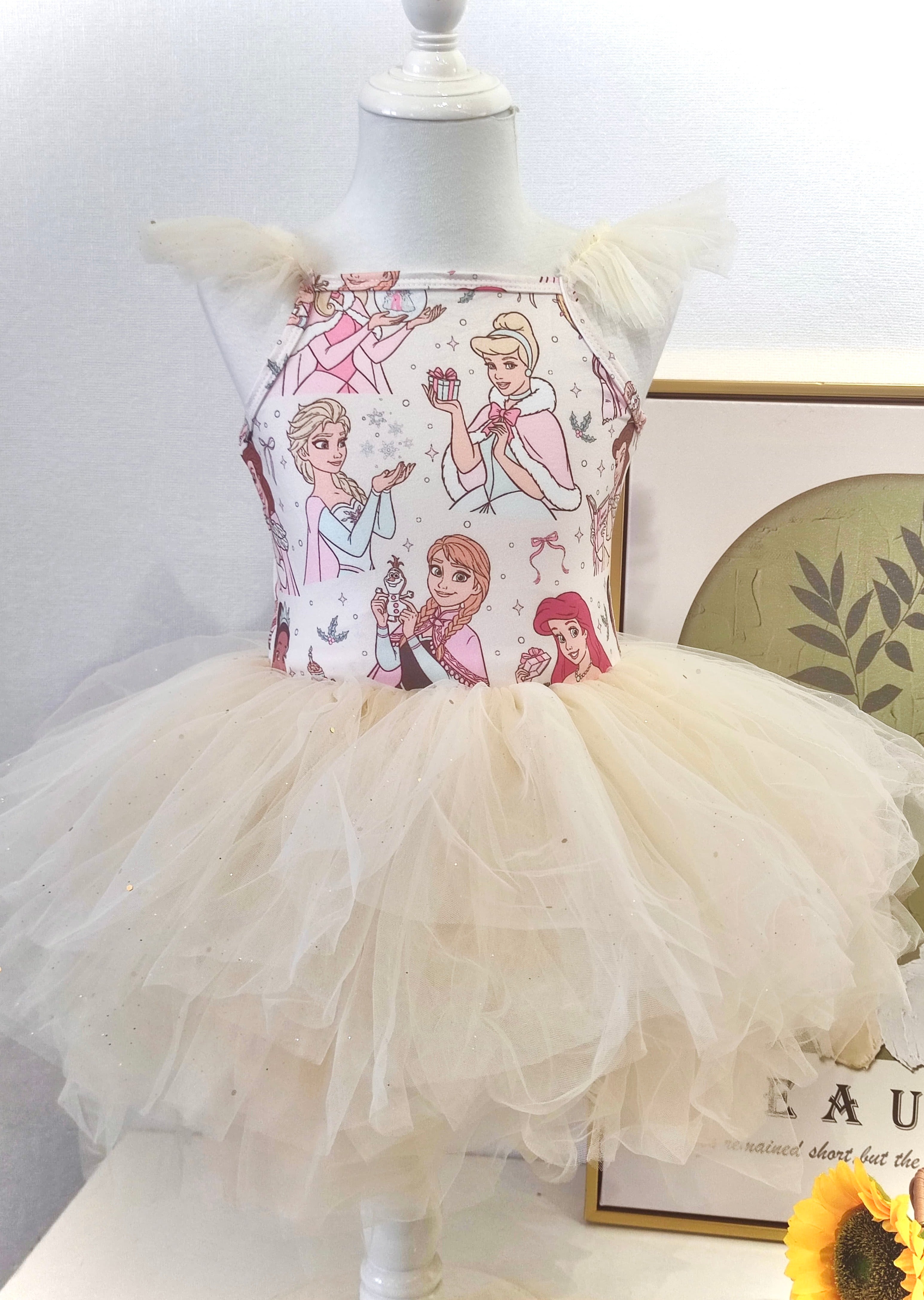 Featuring a beautifully illustrated princess print bodice and a luxuriously fluffy tulle skirt sprinkled with delicate gold shimmer, this dress is pure Christmas enchantment. Perfect for festive photos, holiday parties, or twirling under the Christmas tree, it brings every little princess’s holiday wish to life.